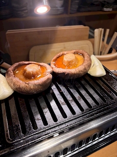 なぎさです❕焼肉屋で私よりもスポットライトが当たってるしいたけ。私の座ってるとこの方がくらい。しいたけと私の差なんてそんなもん。それは嘘で、ここのしいたけ甘くて大きくてジューシーで肉くらい美味しいの。大絶品なの‼️ここ以外で美味しいしいたけ知らない‼️おすすめ‼️なぎなぎ