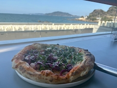 おはようございます 海沿いのカフェでランチ🍙 今回の旅天気に恵まれてた☀️ 本格的なピザでもっちもち れみたんと半分こしたけどぺろりすぎて一つずつたべれたかも^_^