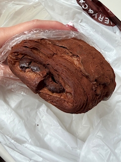 どんぐりの、このチョコパン本当に美味しいの🤍 チョコまみれー🤣 表面のチョコがパリパリしてて、中に入ってるチョコがしっとりしてて最高🥹 仕事前には食べれないからいつも家帰った時のお楽しみにしてるんだぁ🤭